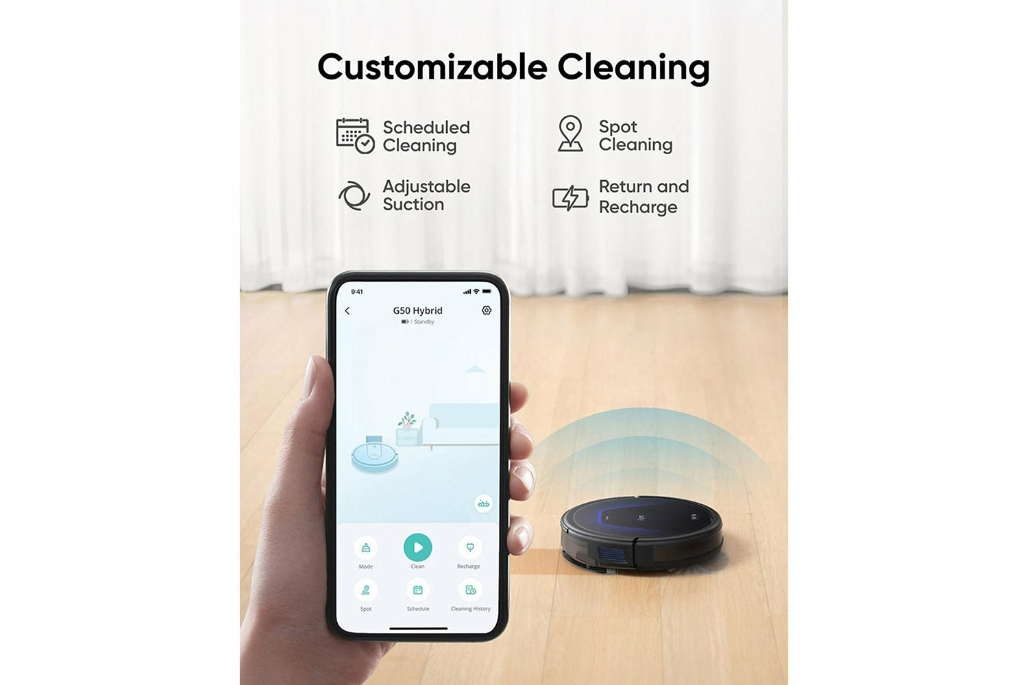 G50 connects to your phone via Bluetooth so that you can schedule cleaning times and start spot cleaning via the eufy app. Note: Make sure you are using a 2.4GHz router or a dual-band router that is configured to support a 2.4GHz frequency band. G50 does not support the 5GHz frequency band.