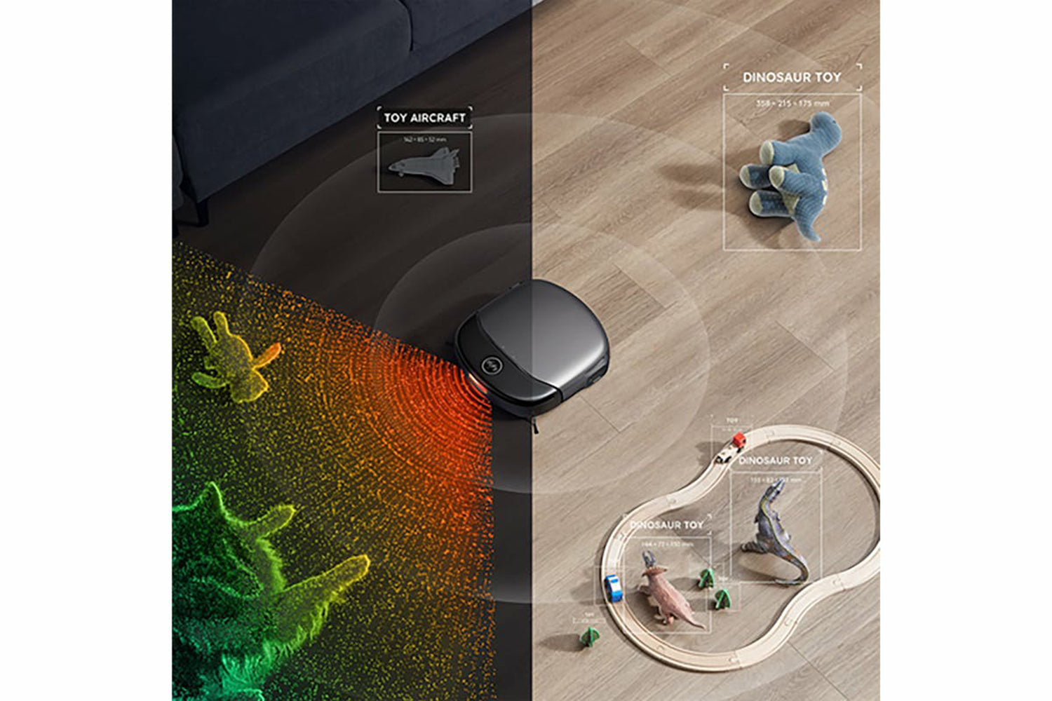 Effortlessly navigates around obstacles* of varyingshapes and sizes including moving objects and smallones like toys, ensuring a smooth cleaning experience.
