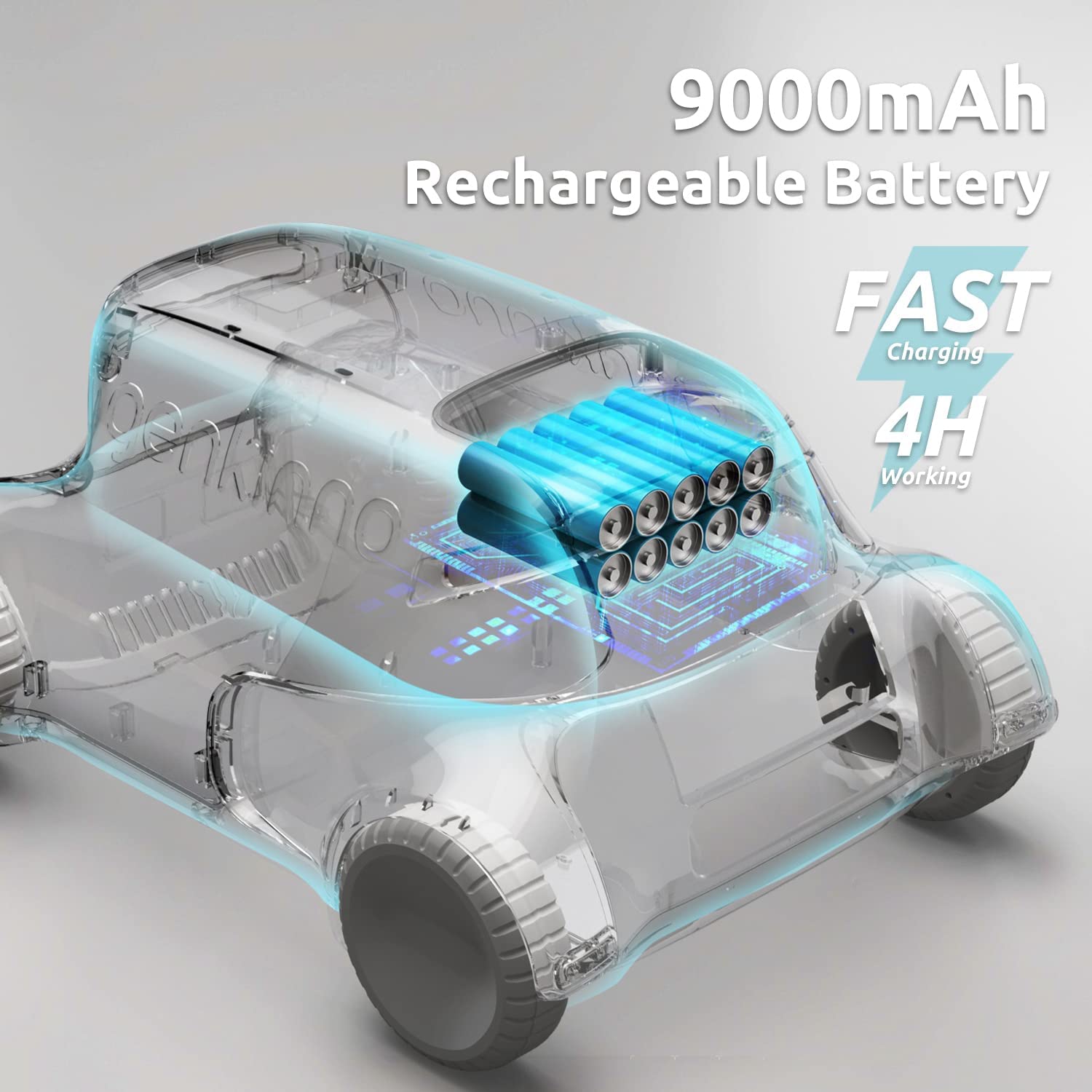 • Compatibility with Different Swimming Pools: Genkinno P1 will leave your pool sparkling clean in just 2 hours. A large 9000mah battery life gives P1 a 4-hour max runtime and up to 2,500 sqft coverage on a single charge. The cordless pool vacuum can effortlessly handle slopes up to 15 degrees, adapting easily to different pool shapes and sizes.