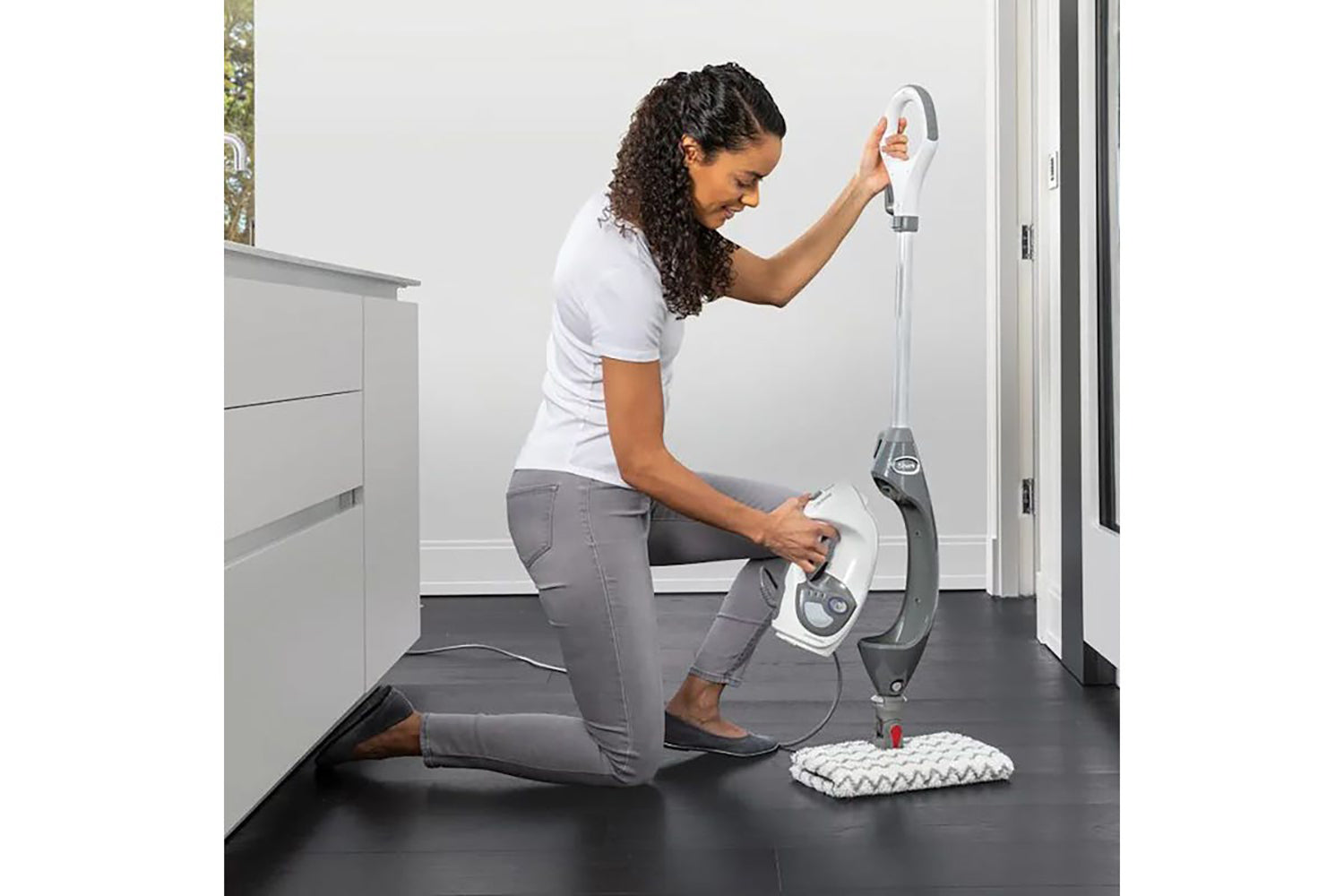 Transform this floor steam mop into a handheld steam cleaner for easy surface cleaning, from kitchen worktops and windows to bathroom tiles and shower screens.
